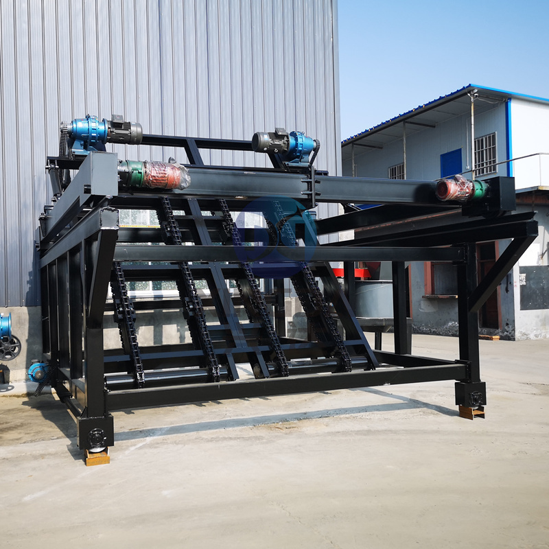 结构:该机分为两个机组:翻抛机组、换槽机组,其中翻抛机组主要负责在发酵槽内前后移动翻抛,换槽机组则负责翻抛机组与每个发酵槽之间来回移动。